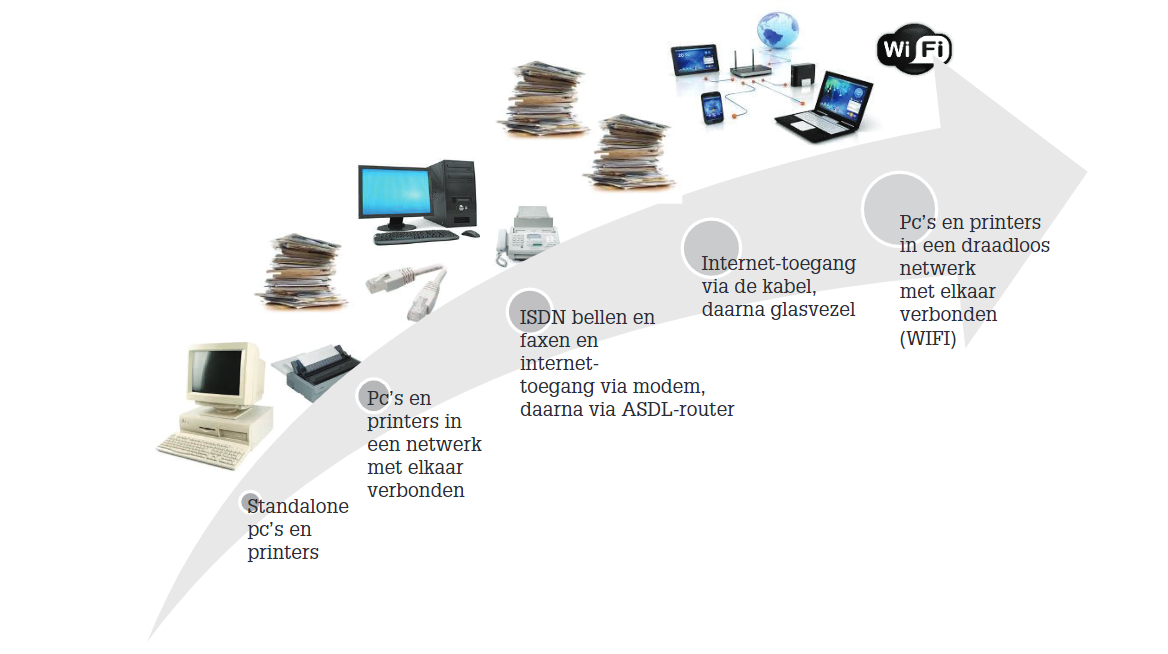 En voor wie zich liever bezig houdt met de aankleding van de bovenverdieping en de relevantie van een toekomstbestendige infrastructuur onderschat: onderstaande afbeelding toont de groeicurve voor IT-infrastructuur van standalone pc’s tot aan draadloze wifi-netwerken richting het Internet of Things, zoals printers die draadloos aan te sturen zijn. Waar in die curve sta je nu of wil je staan?